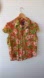 a short-sleeved button-down shirt featuring a vibrant floral pattern, made by Jones New York. The shirt has a red background adorned with large hibiscus flowers in shades of pink and white, interspersed with green tropical leaves. The shirt's design and the brand's association suggest it is a casual or resort-style garment, possibly from a summer collection.