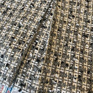 This is a great vintage skirt - multiple panels front and back give a slight a-line look. The fabric is like a tweed but some of the threads are thicker in some parts than in others, giving an uneven surface or effect. Fully lined, invisible zipper centre back and a closed kick pleat in the back as well. The waistband is on the narrow side and there are no belt loops or pockets. Shades of black, creme, tan and offwhite make this very versatile. The black top shown is not included.