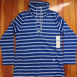 Brand new, with tags Jones New York Signature blue and white striped sweatshirt size small. Drawstring along collar, 4 silver snaps on front, kangaroo pouch with silver snaps on side.