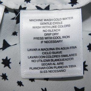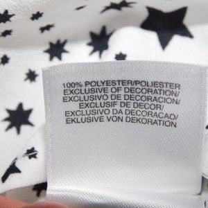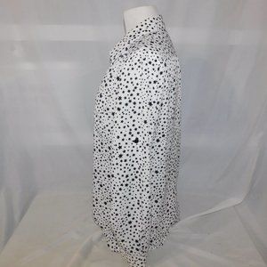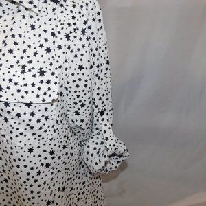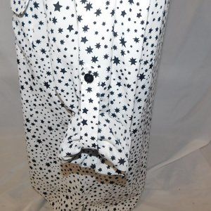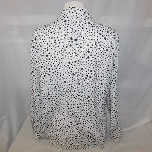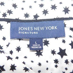 This Jones New York Signature Womens Large White with Black Stars Blouse with Roll up Sleeves is in Excellent clean bright condition. Blouse is 100% Polyester - Machine washable cold - Drip Dry. Features Full Length sleeves that can be rolled up and secured by button to 3/4 Sleeve.
