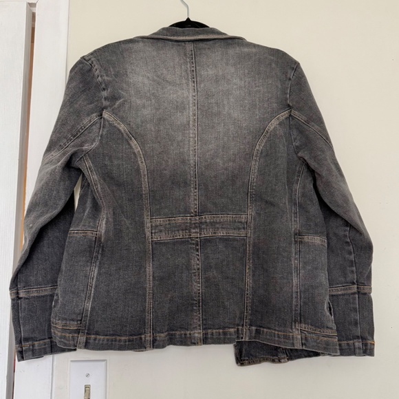 Gorgeous Jones New York denim longsleeve blazer jacket in a dark/almost black wash. Features two front pockets and buttons. Denim is lightweight and has got some nice stretch. Super comfortable.