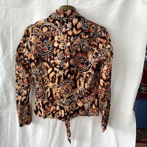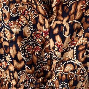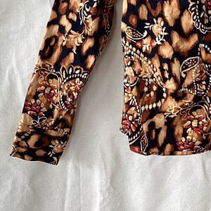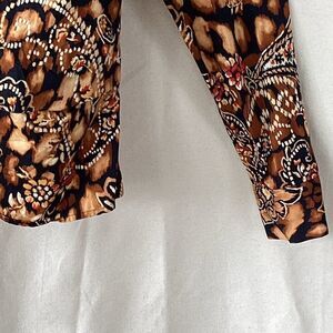 Long sleeve, open front with tie, hidden buttons in front, abstract design, EUC, neck to hem 21”, armpit to armpit at back 19”, armpit to cuff 17.5”