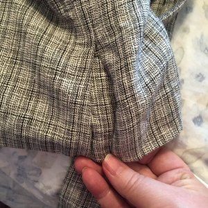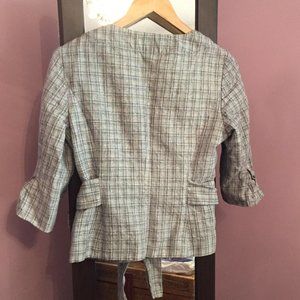 Fully lined jacket has 1/2 sleeves with bell and pleat feature. Self ties can be tied in front or back.
