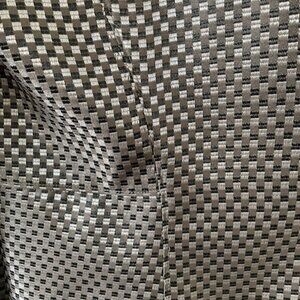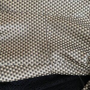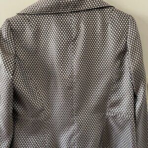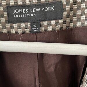 Jones of New York Collection - VTG Jacket -metallic taupe/black and cream small squares – bit of a flare to the bottom of the jacket – fully lined – 2 buttons - polyester – size 10 – measurements from under the arms - 15 in sleeve, 12.5 in side length , 20 in across chest , 21 in back length (from neck to bottom of jacket ) – smoke/pet free home