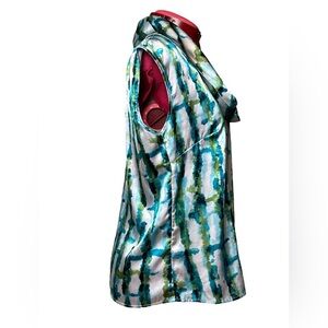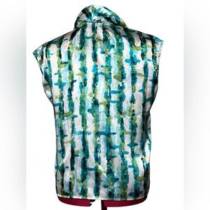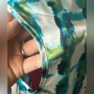 Luxurious satin with French seams, back darts, Calwell neck line, bound at just at the sleeve opening and bust darts for shaping. Watercolour print. Easy care. Great layering piece.