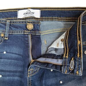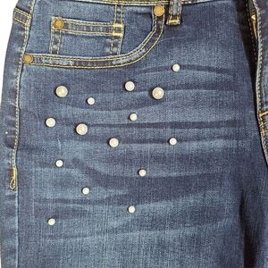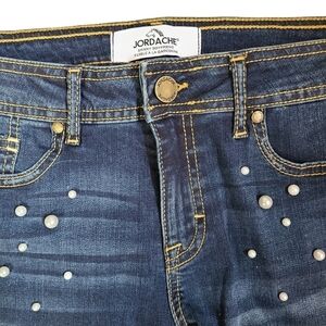 Jordache Skinny Boyfriend denim jeans size 6. In great condition blue in color with white pearls. Please see photos for approximate measurements.