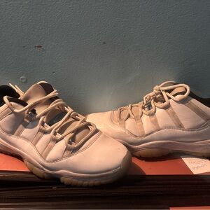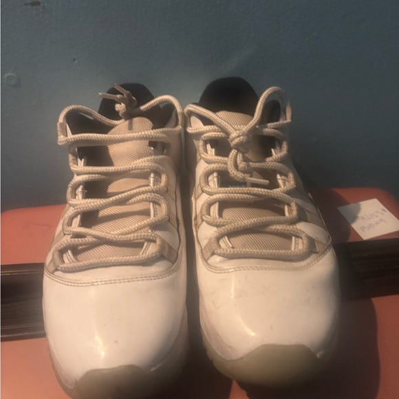 Selling a pair of Air Jordan 11 Low sneakers in a clean white/cream colorway. Classic patent leather design with translucent outsole. Comfortable, stylish, and perfect for casual wear or collectors looking for a wearable pair.