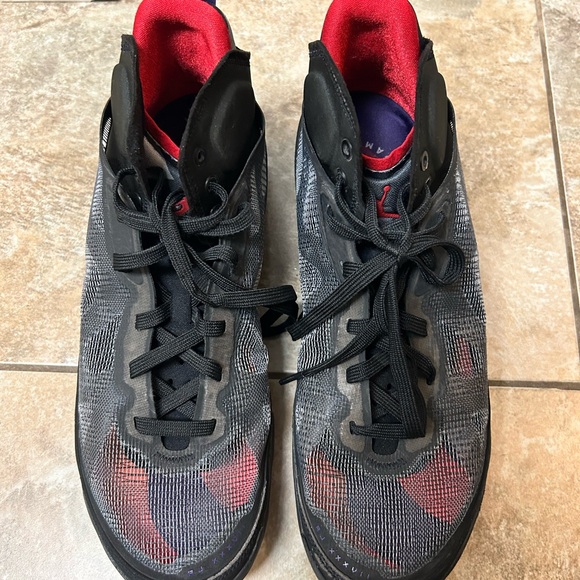 Step up your game with these Jordan 37 Raptor basketball shoes, featuring a sleek black mesh upper accented by vibrant red details. Designed for both style and performance, these shoes offer a Move game day insole included with the shoes. A major comfort upgrade included! Shoes have been used for one season only, gently used but lots of life still in them.
