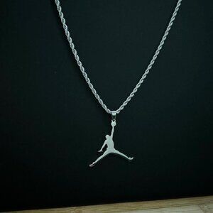 Jordan Jumpman Pendant Necklace - MJ - Silver Plated - 20" Rope Chain Color - Silver Chain length - 20 inch / 50 cm in length Chain type - 3mm rope chain necklace Chain material - Silver Plated Stainless Steel - does not tarnish or discolor - amazing quality Christmas Gift, Xmas Gifts, Stocking Stuffers, Black Friday Sale, Birthday Gift, Jewelry for Her, Jewelry for Him, Jewelry for Women, Jewelry for Men, Gift For Her, Gift For Him, Jordan, Jumpman, 23, Michael Jordan, MJ