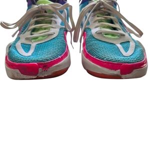 Dynamic Jordan shoes with teal and purple design. Bold pink accents. Ideal for sports and style. **there are couple of flaws in pictures