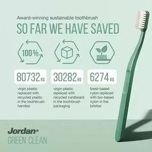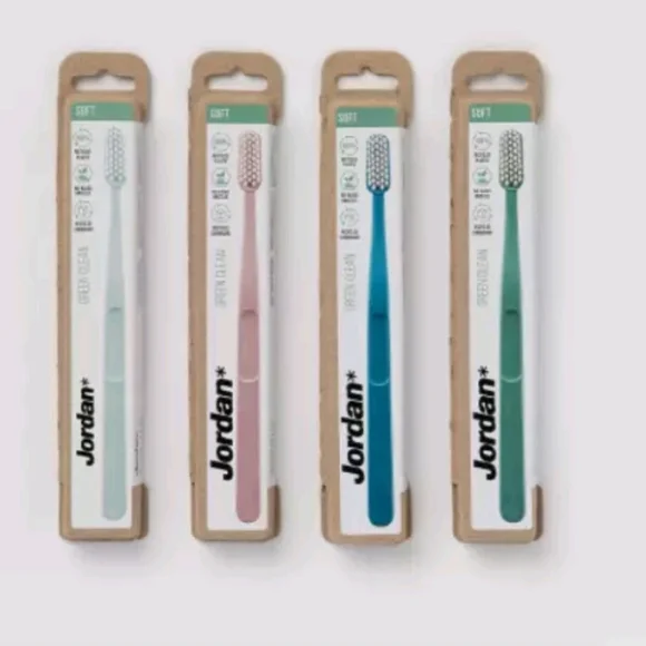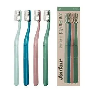 Set of four Jordan soft toothbrushes in assorted colors. Includes white, pink, blue, and green.