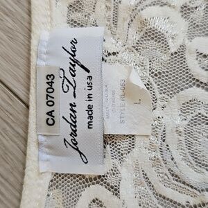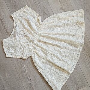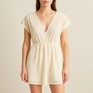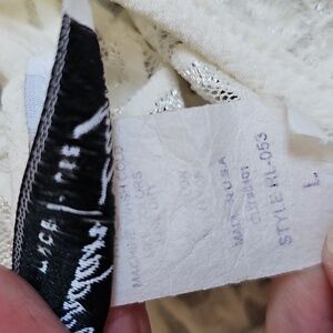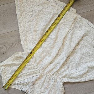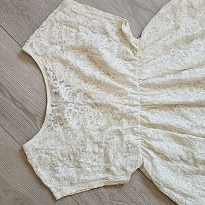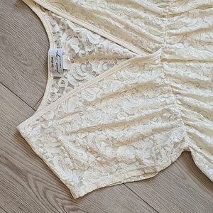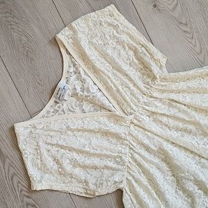 Jordan Taylor ivory floral lace blouse with surplice V-neckline and elastic waist. completely sheer, no lining (** note the stock image generated shows a lining, however there is no lining**). short sleeves. flowy A-line silhouette. size large