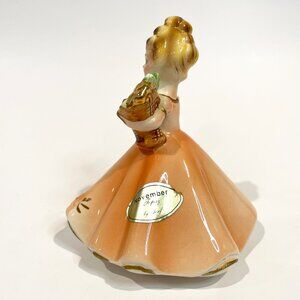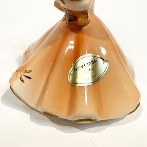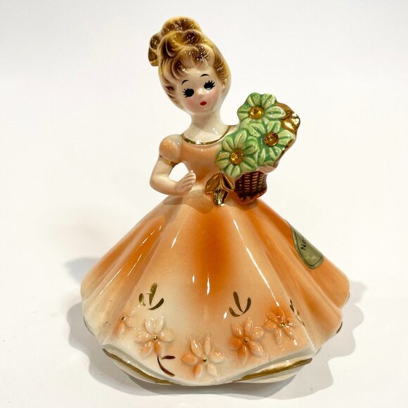 Vintage 1960's Josef Originals November Birthday Birthstone Girl Figurine, depicting a girl wearing an orange dress with green flowers with orange topaz birthstone representing November birthdays. The figurine comes from the Growing Up Girls collection. Made in Japan, this original piece showcases intricate details and vibrant colors, making it a special and nostalgic addition to any decor.