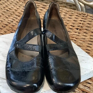 Black patent leather shoes, size 40. Worn minimal as can be seen by the minimal wear/tear and remnant of sticker on bottom. Round toe with slight wedge. Style “Mary Jane” - excellent quality and comfort brand name.