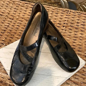 Black patent leather shoes, size 40. Worn minimal as can be seen by the minimal wear/tear and remnant of sticker on bottom. Round toe with slight wedge. Style “Mary Jane” - excellent quality and comfort brand name.