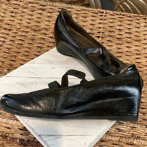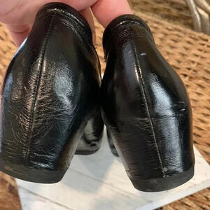 Black patent leather shoes, size 40. Worn minimal as can be seen by the minimal wear/tear and remnant of sticker on bottom. Round toe with slight wedge. Style “Mary Jane” - excellent quality and comfort brand name.