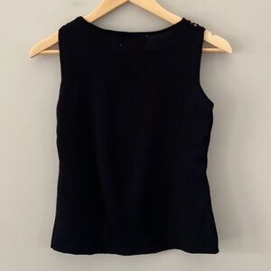 This stylish vintage tank top by Joseph A features a sleek black design with eye-catching embellishments along the neckline. The sleeveless cut and tailored fit make it a versatile piece for any wardrobe, while the decorative accents add a touch of elegance.