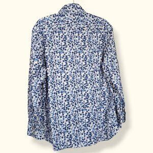 This long sleeve dress shirt by Joseph Abboud is made of 100% cotton and features a fine blue floral pattern on white. The shirt has buttoned sleeve cuffs, a buttoned front, standard collar, and a rounded bottom. There are also extra buttons sewn onto the side tag. The shirt has normal wear, but no issues affecting wearability. There are areas that have grey in the pattern but it's deliberate.