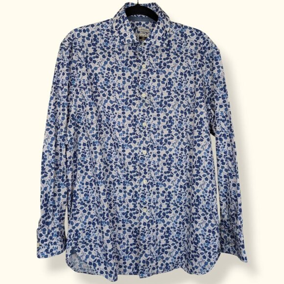 This long sleeve dress shirt by Joseph Abboud is made of 100% cotton and features a fine blue floral pattern on white. The shirt has buttoned sleeve cuffs, a buttoned front, standard collar, and a rounded bottom. There are also extra buttons sewn onto the side tag. The shirt has normal wear, but no issues affecting wearability. There are areas that have grey in the pattern but it's deliberate.