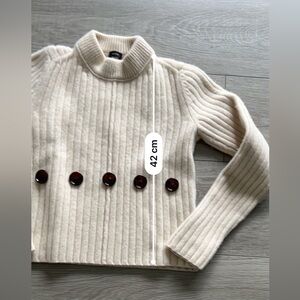 Elevate your wardrobe with this timeless Joseph ribbed wool cardigan in a neutral cream color. Made from 100% soft wool, it features elegant ribbed detailing and large dark tortoiseshell buttons for a sophisticated look. This sweater is cozy yet stylish. Gently worn and in excellent condition no visible signs of use.