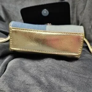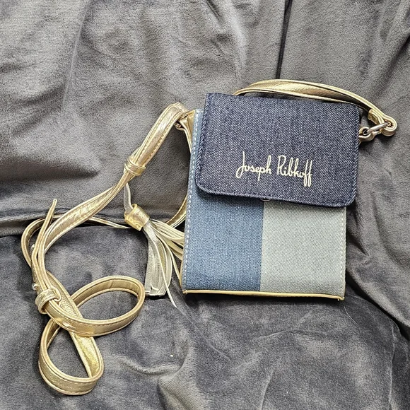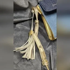Joseph Ribkoff patchwork denim & metallic gold crossbody tassel mini purse. New without tags