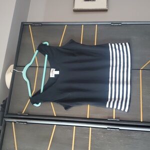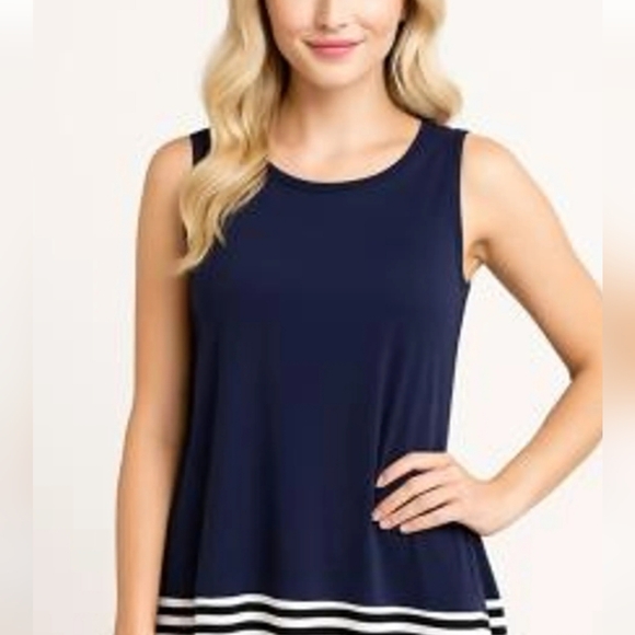 Elegant black sleeveless top featuring a stylish striped hem. Perfect for casual outings or a day at the office.