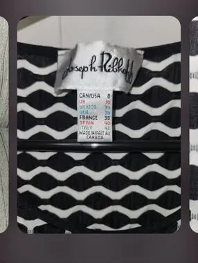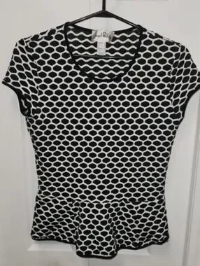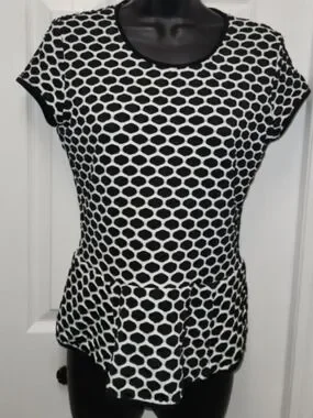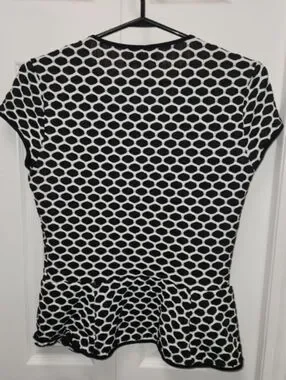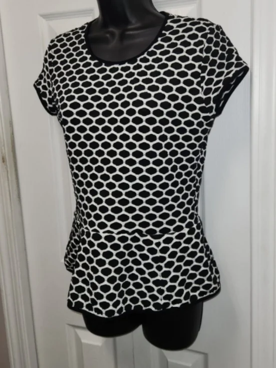 🌿 Joseph Ribkoff black + white top. Capped sleeves, peplum, polyester blend so easy care. Pit to pit- 18" inches Length- 22 1/2" inches 😍