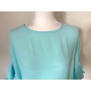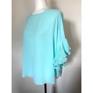 *Price Reduced*. Reposhing this stunning aqua blouse in a washable light crepe fabric. Gold accent zipper down back. Features dolman style ruffled sleeves for a chic look. PTP approx 20-21”. Fits big, more like a 12. No issues. I love it but it’s too big for me.