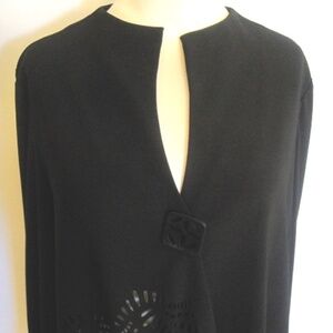 Joseph Ribkoff asymmetric jacket with cut-out detail. Color: Black (last three photos differ from actual garment but represent style and fit).SIZE: 10. This classic swing jacket will add timeless elegance to any outfit. Features: