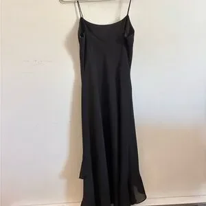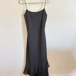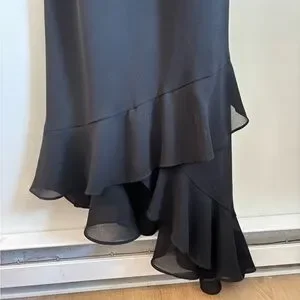 [This stunning black dress by Joseph Ribkoff features a chic asymmetrical high-low hemline with ruffled details, perfect for a cocktail night out. The sleeveless design with spaghetti straps and slip style offers a sleek and sophisticated silhouette. Its minimalist elegance makes it a versatile addition to any wardrobe.]
