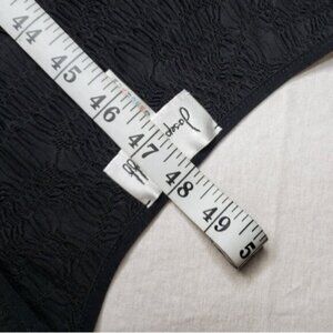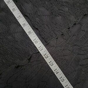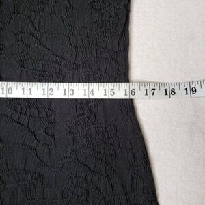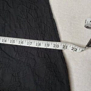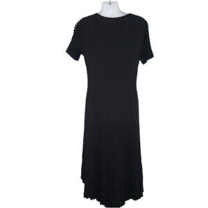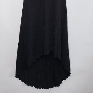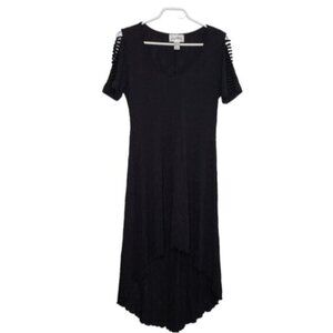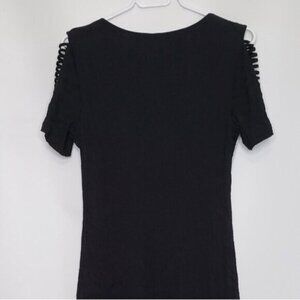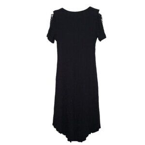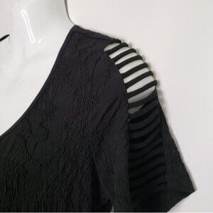 Black textured material with round neckline and hi low hem. Short Sleeves with cut out detail LBD Little Black Dress
