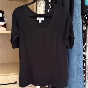 Chic black ribbed top by Joseph Ribkoff. Short sleeves and scoop neckline. Versatile and stylish.