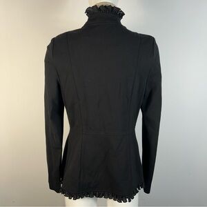 Tailored Joseph Ribkoff blazer with decorative double-breasted buttons. Ruffle trim along front placket, collar, and hem. Structured silhouette with long sleeves. Elegant military-inspired detailing. Versatile piece for dressy or work looks. Re-poshing this one: Beautiful but too small for me.