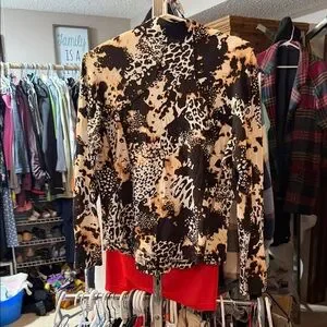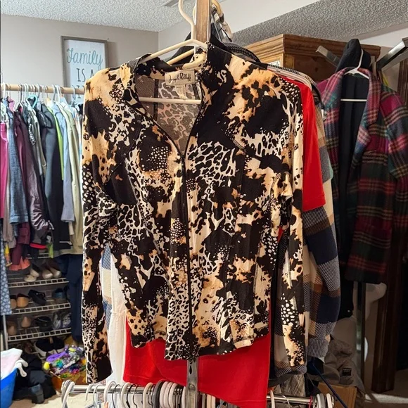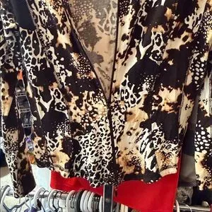 Chic jacket with a striking black and tan pattern. Features a stylish zip-up design.