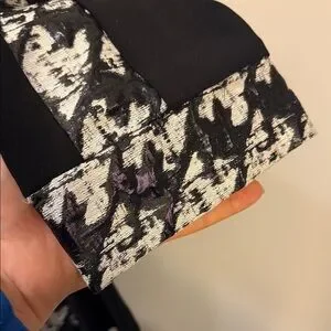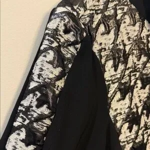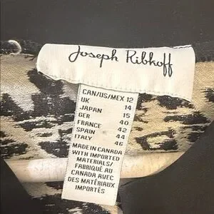 Stylish Joseph Ribkoff jacket with bold black and white pattern. Button-front styling. Three-quarter sleeves. Polished, versatile look for layering.