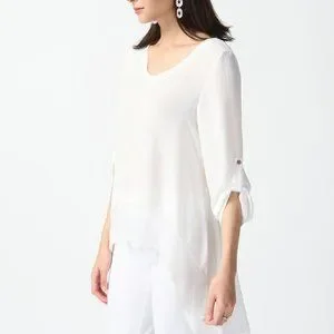The flared silhouette of this high-low top exudes flawless sophistication. The light gauze fabric paired with the mesh band at the bottom give an airy feel to this contemporary design that is accentuated with every movement. The crew neck and three-quarter length sleeves with tabs infuse a casual elegance to this unique sartorial find.