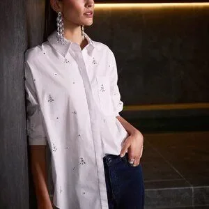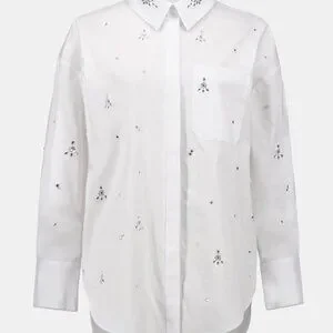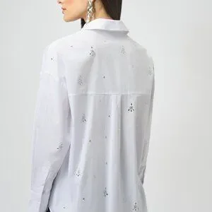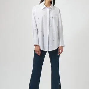 This blouse features a classic shirt collar, hidden button-front closure, and a relaxed fit for all-day comfort. Crafted from stretch cotton, it’s accented with sparkling rhinestones at the collar for a touch of refined elegance.