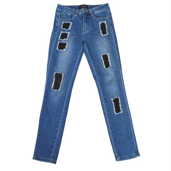 Stylish cropped jeans by Joseph Ribkoff. Features blue denim with black patch accents. Perfect for casual wear.