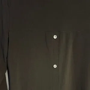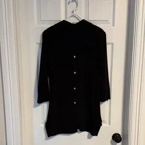 Joseph Ribkoff button-front tunic in black. Soft, flowing fabric with a relaxed silhouette. Point collar and full button placket. Three-quarter sleeves and a slightly longer hem. Easy to dress up or down. Button detail on back.