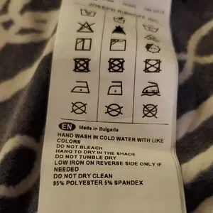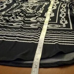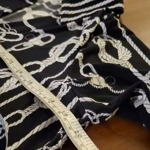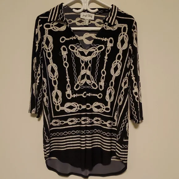 Collar, V-neck with 3/4 sleeve and curved hem. Nautical ropes and chains. Very dark almost black navy blue and cream. 95% polyester 5% spandex.
