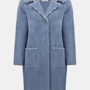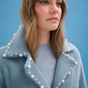 This feather yarn sweater coat offers a relaxed fit with a notched collar and long sleeves. Featuring patch pockets and a snap closure, it’s adorned with elegant pearl trims at the collar and pocket, bringing a touch of sophistication to a cozy, unlined piece.