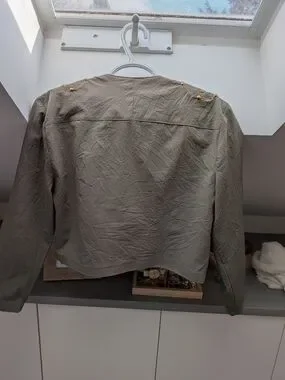 Women's jacket with decorative gold bead detailing on the shoulders. Lightweight structured silhouette for a polished look. Styled with a wrinkled look or can be ironed to look more polished. No size tag but fits like a S/M. Hem can fall, fixed by ironing or fabric tape to secure.