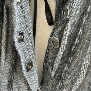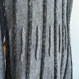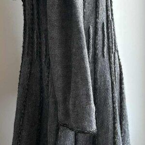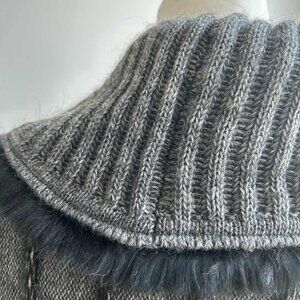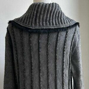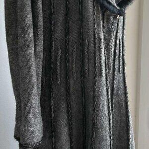 Known for polished statement layers and refined finishing, Joseph Ribkoff delivers quiet luxury here: a dark heather-grey swing knit sculpted with vertical channel-stitch panels and crowned by a plush faux-fur–edged shawl collar. Pair it with denim, a slim black turtleneck, and heeled boots for modern ease, or over maxi skirt for a boho chic vibe.