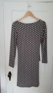 A lovely fitting dress for anyone with a belly to hide; a second piece of fabric completes the ruching. Fully lined and made of viscose. The sizing runs small for a 10. The primary color is greyish brown with tan polka dots.