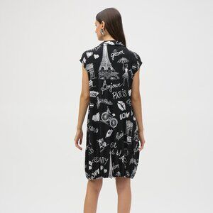 A masterpiece of modern style, this silky knit dress makes a statement on every occasion. The garment’s alluring conversational print and cocoon silhouette pair beautifully, exuding dramatic flair. The sleek shawl collar and short cap sleeves lend a refined feel while the elastic cord at the hemline adds character to the design.