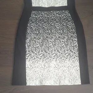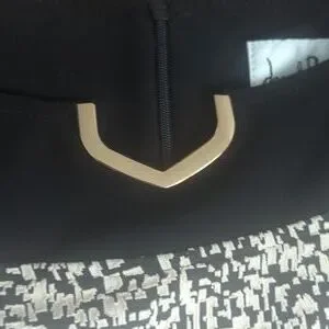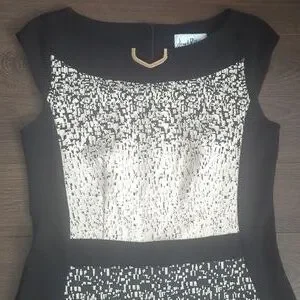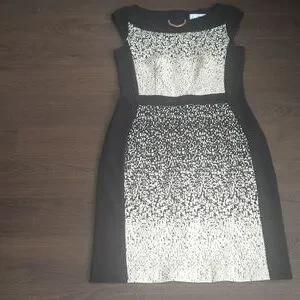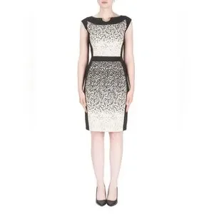 A slitted bateau neckline makes this Joseph Ribkoff A-Line dress a classic. The front features a beige minutia-like pattern with a solid black rear. The waist of the dress is cinched in with a black strip of fabric diving the torso from the skirt at the narrow of the waist.