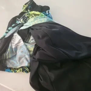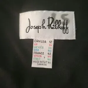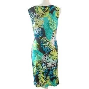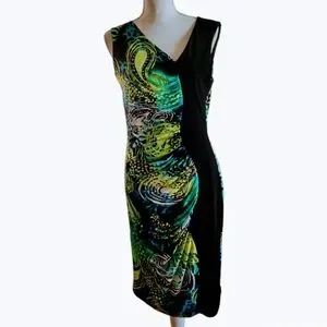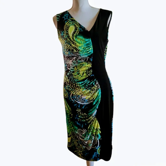 Fully lined, sleeveless, fitted Joseph Ribkoff colourful sheath dress. Dress has slimming hourglass effect with sidepanels and front ruching. No fabric tab, but I believe it to be a poly blend with stretch.