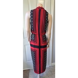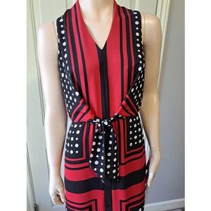 Beautiful fully lined midi dress with a front tie and back zipper. The buttons on the front don't open. The fabric tag is missing, but I'm pretty sure it is 100% polyester. There is no stretch, but it has elastic on the back of the waist.