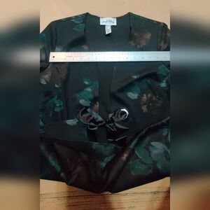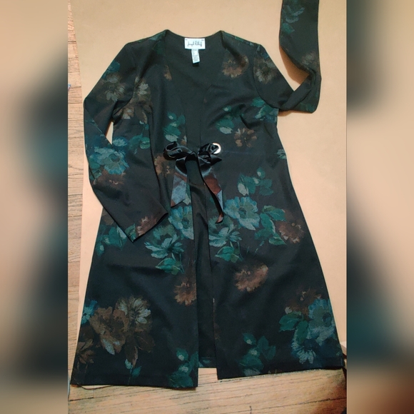 This lovely jacket looks super over a little black dress..says size 8 but because it is not buttoned up all the way it will fit if you are a 10 as well.