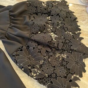 This elegant black off-shoulder top features beautiful lace detailing on the sleeves, perfect for a chic and stylish look. Ideal for both casual outings and special occasions. Lace, chic, formal